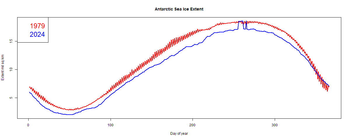 OK, here is the cherry picking. A graph of 1979 vs 2024, day by day. There was more ice in 1979 for almost the whole year, but for some reason 1979 did a dive at the end.