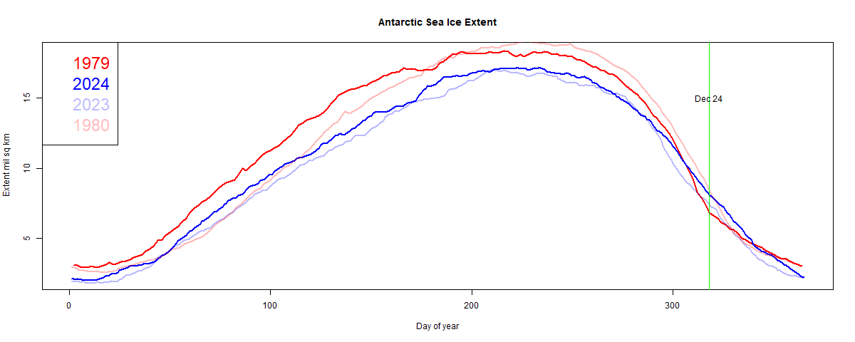 Ice, like most things, has natural variation. 2024 had less ice, day for day, than 1979 over the last year. But it happened that melting was a bit slow in December in 2024.