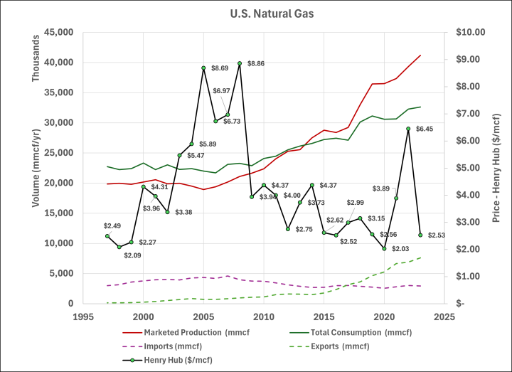 From 1997-2012, the US consumed more natural gas than we produced and the average price was $4.76 per thousand cubic feet (mcf). Since 2013, we’ve produced more natural gas than we consumed and the price averaged $3.35/mcf. If we take out the anomalously high prices in 2022, it would have averaged about $3.00/mcf.