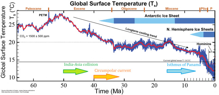 Take a look at the drift reconstruction and the image below will then make sense. The absolute key to our climate now is the formation of the Antarctic circumpolar current as Rud pointed out above. While-ever this current keeps running, oceans will not boil, Antarctica will have continental ice and global surface temps will max out at 18-20 degC. The long term cooling trend shown on the image below is due to Antarctic ice and ocean cooling.