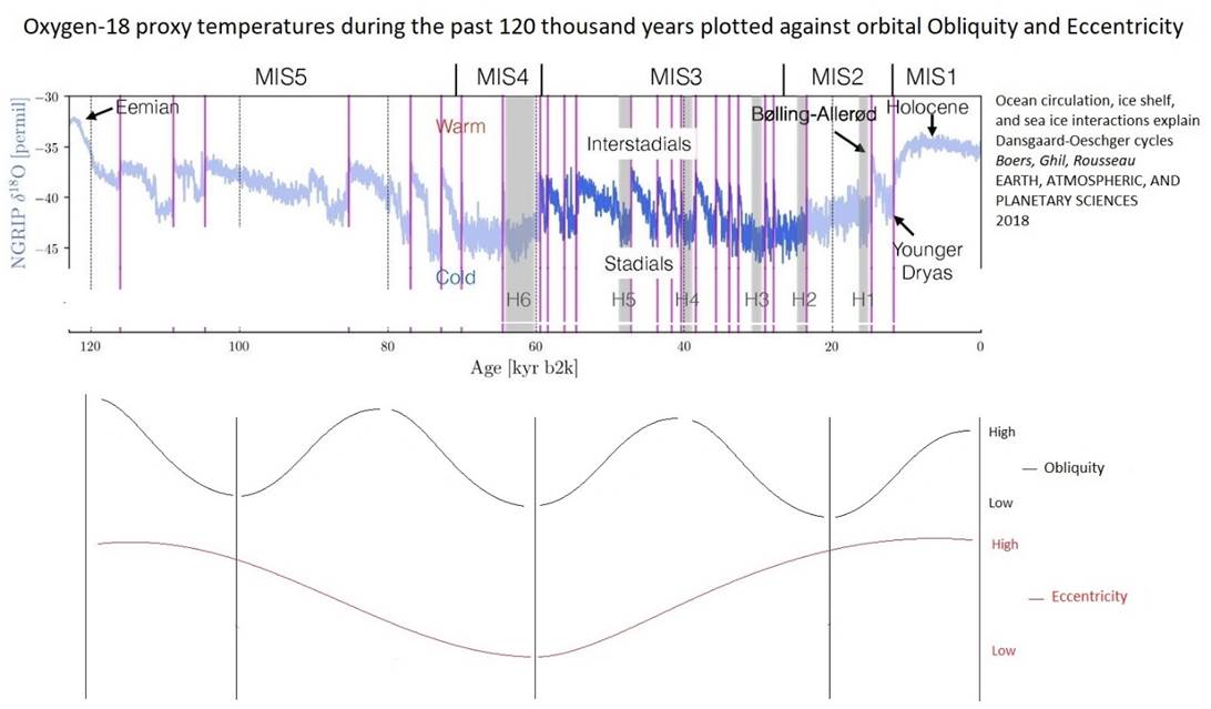 “As eccentricity and obliquity just begin to fall, we see temperature “jumps” (D-O events) in closely packed time regions. These hot blips are probably solar activity driven warm-ups.”