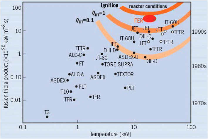 The big problem with fusion plasmas, aside from stability, is something heated to millions of degrees really wants to radiate its heat. ITER is an attempt to keep the plasma hot by making the plasma really big – taking advantage of the improved surface area to volume ratio of larger objects. Heat generation is governed by volume, while heat radiation is governed by temperature and surface area.