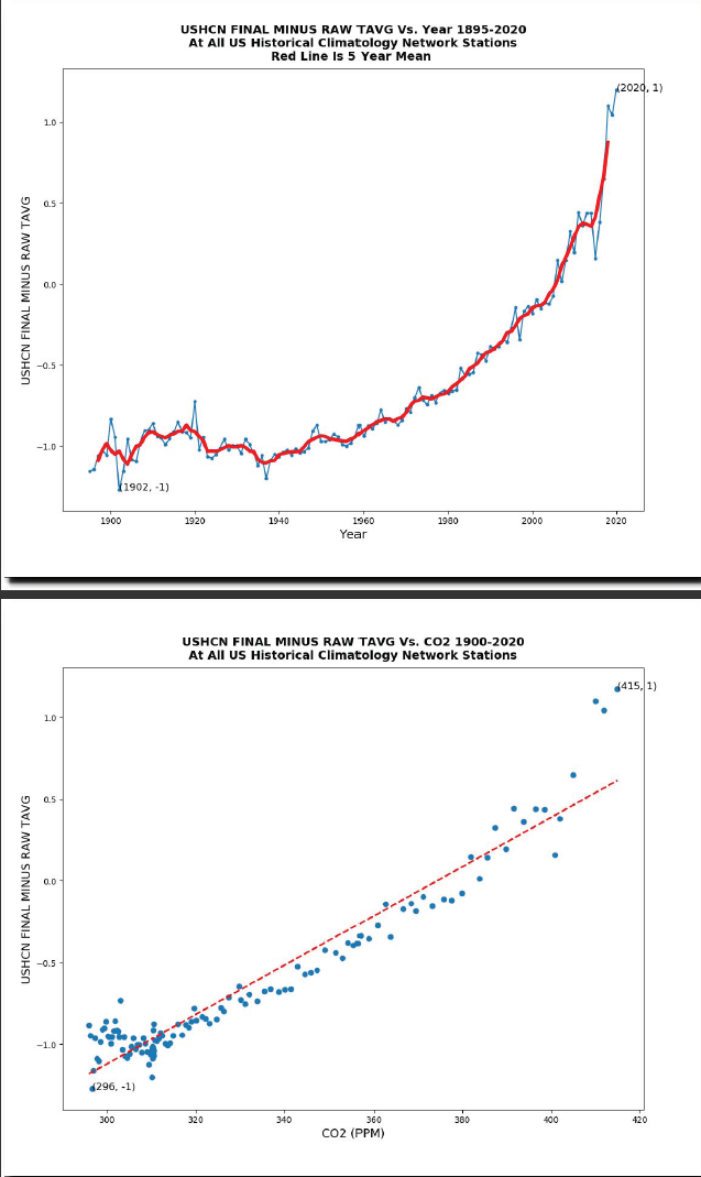 “REPEAT the Adjustments exactly follow the increase of CO2 for the past century+. Therefore those adjustments are fraudulent and most assuredly non scientific as in adjusting data to fit a theory.”