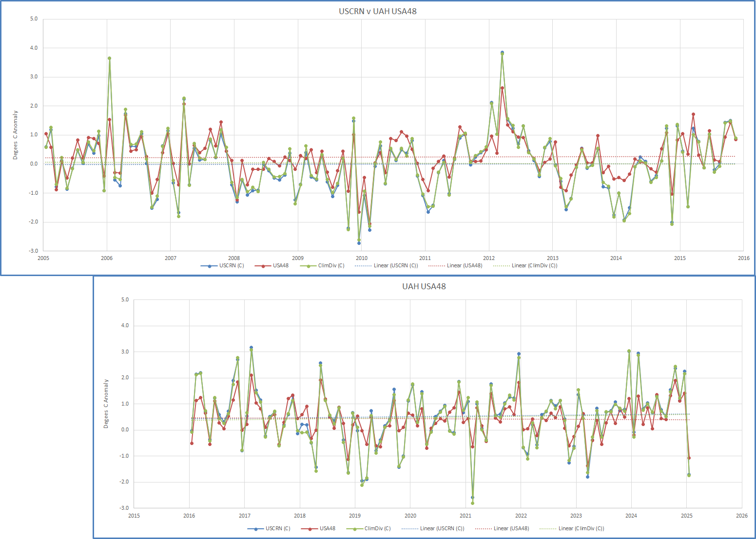 In the period up to January 2025 the ‘pristine’ USCRN is warming faster than the adjusted ClimDiv.