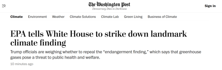 The Washington Post published a report today stating that the Environmental Protection Agency (EPA) has advised the Trump administration to repeal the 2009 “endangerment finding,” which classifies greenhouse gases as a threat to public health and welfare. This finding has underpinned federal emissions regulations for over a decade. The Post suggests that such a move, if enacted, would mark a significant shift in U.S. climate policy. The story relies on unnamed sources, leaving its claims unverified but noteworthy given the potential implications.
