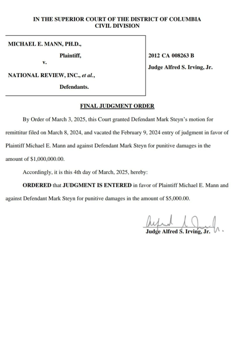Today, we raise a cheer for reason, justice, and the unyielding spirit of free expression! Today, the Superior Court of the District of Columbia delivered a resounding blow to overreach in the long-running defamation lawsuit brought by climate scientist Michael Mann against conservative commentator Mark Steyn. In a Final Judgment Order, Judge Alfred S. Irving, Jr. reduced Steyn’s punitive damages from an astronomical $1 million to a modest $5,000—vindicating Steyn, protecting open debate, and sending a powerful message about the limits of legal bullying.