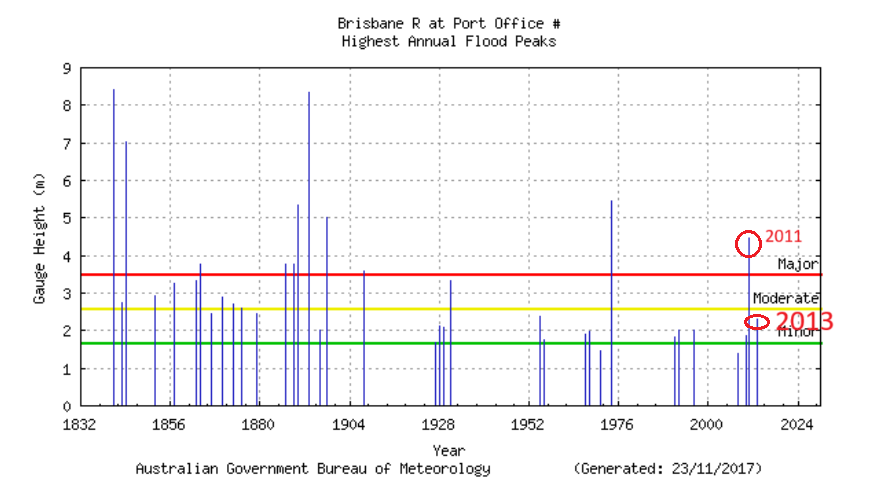 In 2013 Brisbane was impacted by Cyclone Oswald, and suffered a severe rainfall and flooding event.