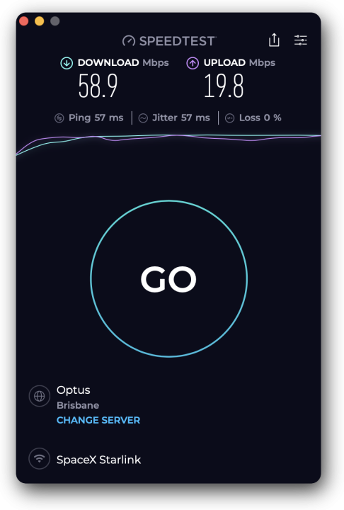 PS—I’m at my mate’s house in Oz, and it’s my first time going online with SpaceX Starlink. Here’s the Ookla Speedtest results … not exactly blazing fast, but it works very well.