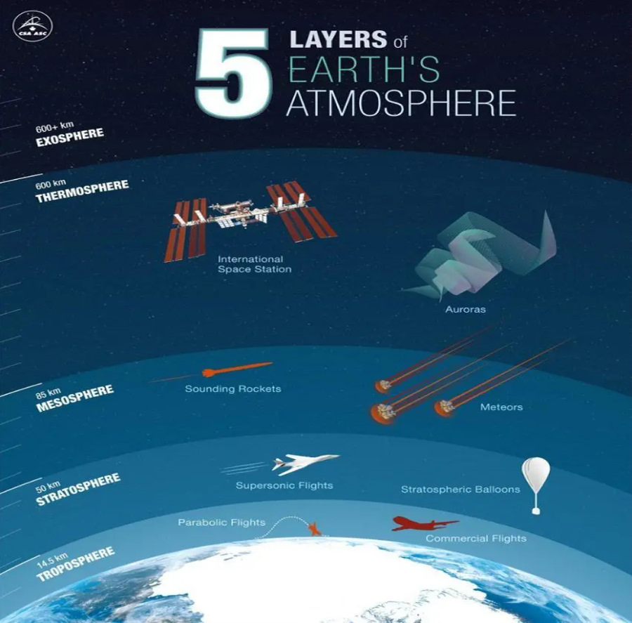 The thermosphere, seen in the graphic from The Canadian Space Agency below, is primarily heated by the Sun’s intense ultraviolet radiation, and its temperature and density fluctuate significantly in response to the 11-year solar cycle. When solar activity is high, the thermosphere expands, increasing drag on satellites and space debris. Conversely, during solar minima, the thermosphere contracts. These natural solar-driven variations completely overshadow any potential effect from anthropogenic CO₂.