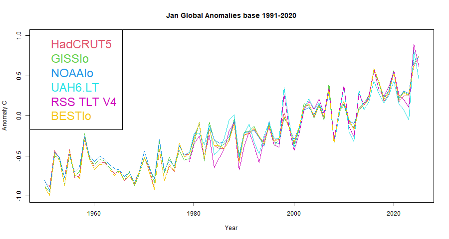 Here is the average January anomaly for six different indices, including UAH, set to the common bsae of 1991-2020. They all tell the same story, for the simple reason that they are all getting it right.