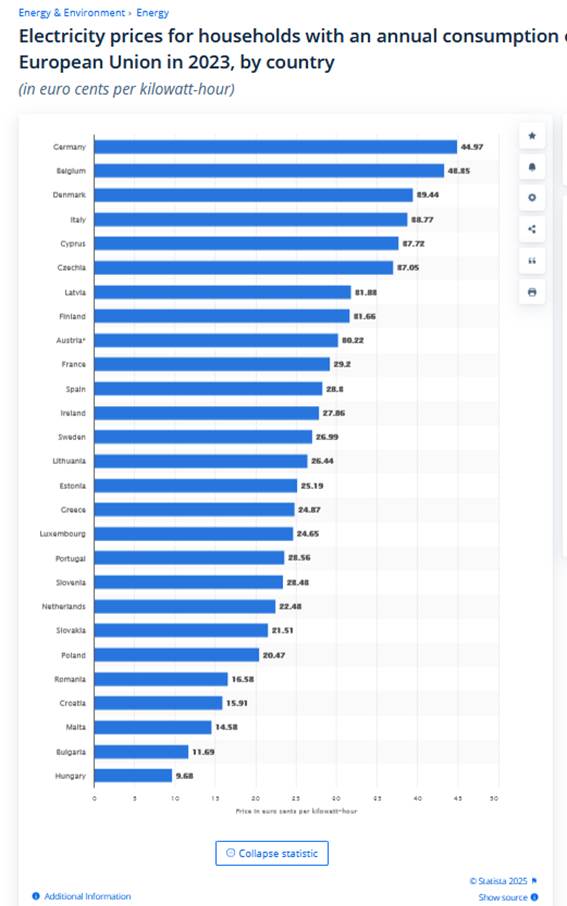 Note that the household price average shows a large difference between EU countries that use coal, nuclear, and gas vs those that have focused on wind and solar. For example, as shown in the chart above, according to Statista, using 2023 data, Hungary’s electricity price was 9.68 Eurocents/kwh (50% of their electricity is from nuclear, 38% coal & gas) and Bulgaria which relies mostly on coal and nuclear was around 11 Eurocents/kwh, whereas Germany, which has “doubled down on renewables” (and closed down its nuclear), was the highest at 44.97 Eurocents/kwh and Denmark which has a small population and a whole lot of windmills was at 39.44 Eurocents/kwh!