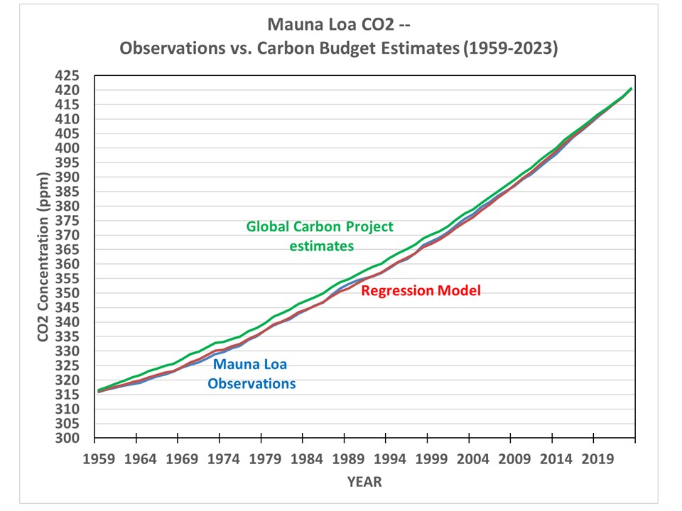 By choosing the “best” models and estimates of CO2 fluxes (those which best explain year-to-year changes in atmospheric CO2 content as measured at Mauna Loa, HI) for the period 1959-2023 as provided by the Global Carbon Project, a multiple linear regression of yearly Mauna Loa CO2 changes against those “best” estimates of sources and sinks leads to the following alterations to the “official ” Global Carbon Project estimates of the sources and sinks leading to the observed rise in atmospheric CO2. (NOTE: being a statistical exercise, this does not constitute “proof”… these are just some areas that carbon budget modelers might want to look into when tweaking their models):