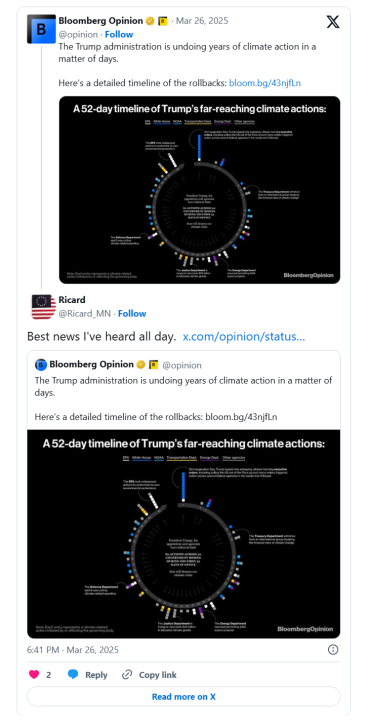 As “climate change” is removed from the national threat assessment, a Bloomberg opinion piece provides a great list of all the winning Team Trump has had over the past 52 days.