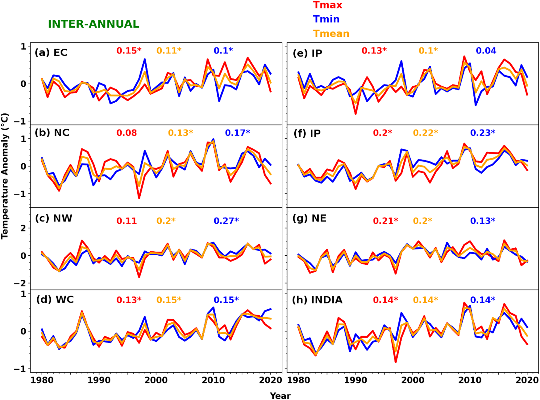 a–h Annual averaged maximum (Tmax), temperature (Tmin) and mean (Tmean) temperature from the IMD data in the temperature homogenous regions and entire India from 1980 to 2020. The numbers at top of each panel represent the temperature trends (°C per decade) and the star indicates that values are statistically significant at the 95% CI. Here, NW is Northwest, WH is Western Himalaya, NC is North Central, NE is Northeast, EC is East Coast, WC is West Coast and IP is Interior Peninsula.