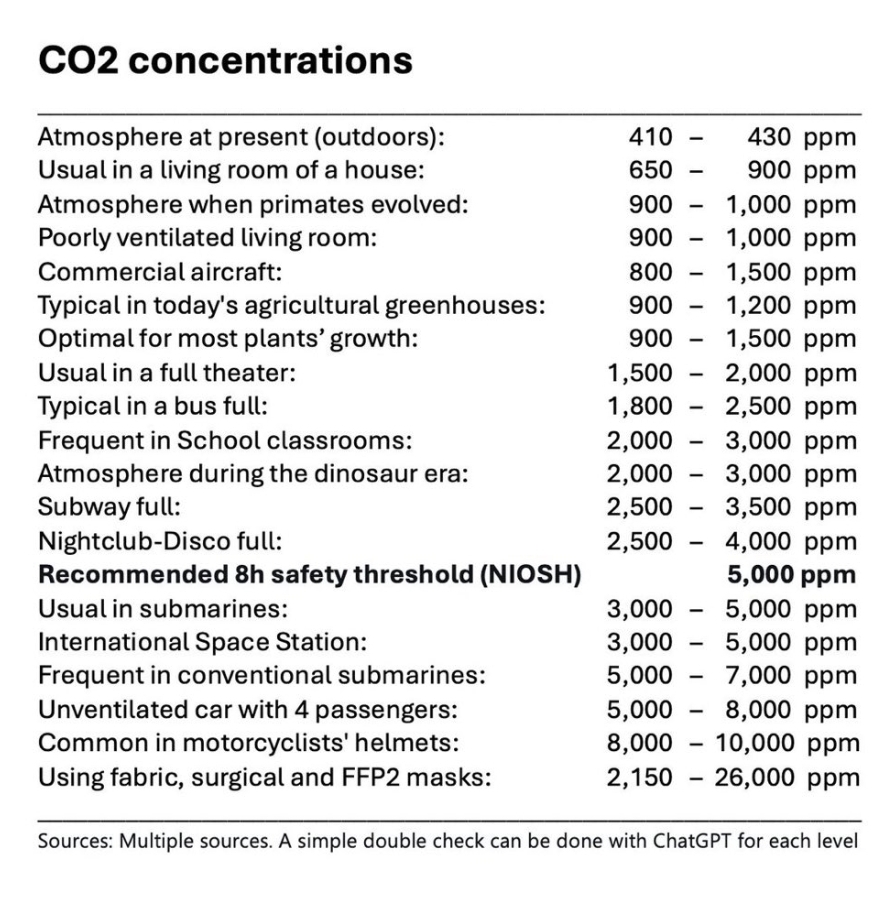 BobM: On submarines, the crew consists mostly of young, physically fit, and well-conditioned individuals who undergo rigorous training and acclimatization to operate in controlled environments. This demographic is far from representative of the general population, making their ability to tolerate higher CO2 levels an imperfect comparison. If the crew consisted entirely of marathon-level athletes, the example would diverge even further from everyday scenarios. General populations face exposure to CO2 in uncontrolled settings, often with the added challenges of dust, pollen, and other airborne particulates.