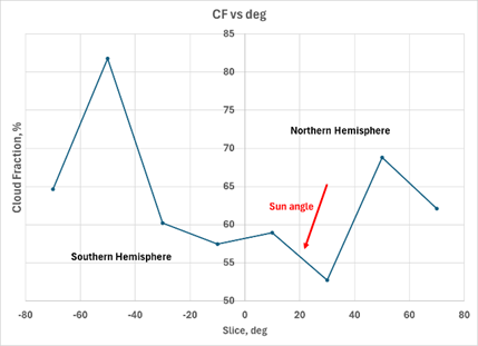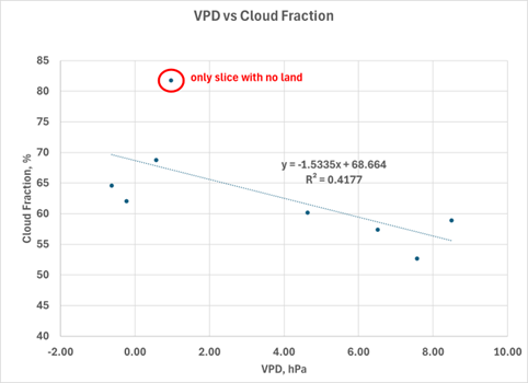 Slicing the earth’s data reveals the change in atmospheric VPD and En vs latitude correlate to cloud fraction. The earth’s slices suggestion that lower land cover in a slice may be related to cloud cover in addition to the expected sun angle.