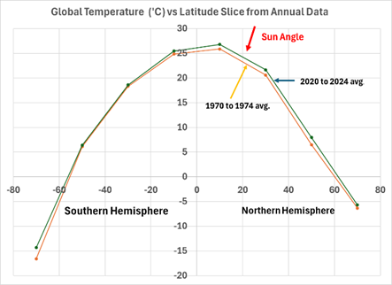 The earth was sliced in 20 deg sections shown in Figure 4. The expected temperature profile shows a small shift in temperature from the 1970 period to the 2020 period with the maximum change in temperature occurring either side of the angle the sun is hitting, no surprise.