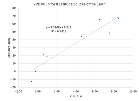 The annual data was sliced into 8 slices by latitude to obtain data of the temperature (Temp), specific humidity (SH), and cloud fraction (from NASA’s Physical Science Laboratory, (4) and Climate Explorer, (3)). Temp and SH are the only variables needed to calculate VPD and En. En is a variable that measures the heat (potential energy) present in the atmospheric air at the altitude the Temp and SH data was taken. En is the atmosphere’s part of the earth’s energy budget (Changes in En are part of the Earth’s Energy Imbalance, EEI).