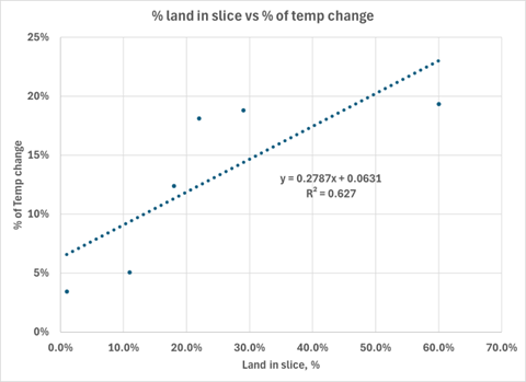 The CRGW model for predicting climate change relies on a good correlation of VPD to Cloud Fraction and Enthalpy. Figures 6 and 7 show that the looked for correlation is present in the earth’s slice data as well as the correlations used in the model. Figure 6 has an interesting point that does not seem to belong (circled in red) that is the only data point that has no land in it’s slice. With that curiosity Figure 8 was plotted showing that the amount of land in a slice correlates to the percent of the temperature change in that slice. This is the expected correlation for the CRGW theory: since the change in ET originates from land it should correlate to land area.
