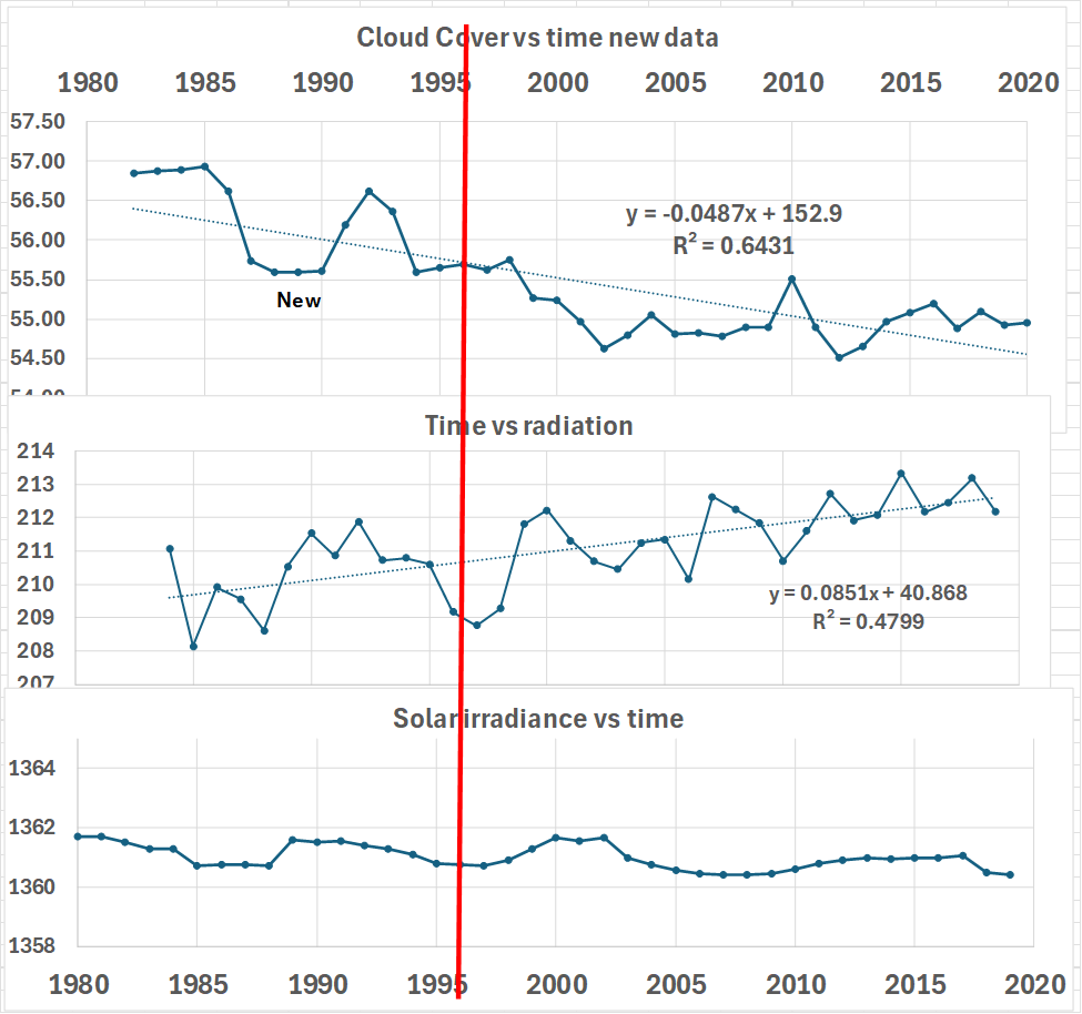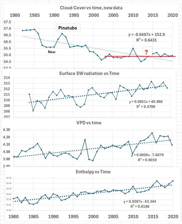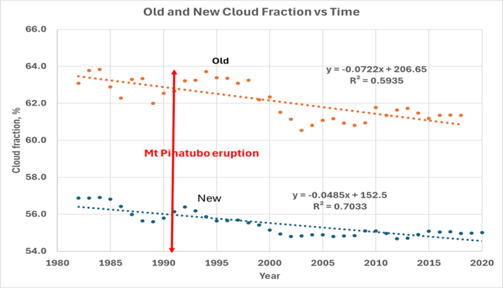 New Cloud Fraction, CF, data was found at Climate Explorer (3) , Figure 1. The big decrease (from previous) in average cloud fraction is very noticeable. The decreasing slope is a little less than the old data (downloaded in 2021). The new CF data has a better R^2 and both old and new data seemed to suggest no decrease in CF after 2003. The new data shows Mt Pinatubo eruption (1991 to 1994) better than the old data.