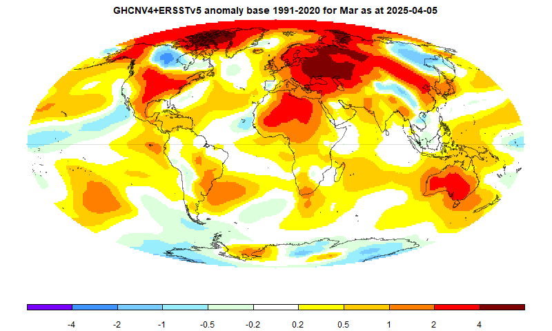 For comparison here’s my map using ERA data for March 2025.