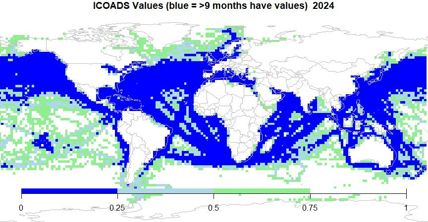 ERSST provides a very full grid. HadSST is more conservative but still uses interpolation and some extrapolation to produce as full a grid as they can. Compare these two maps to the ICOADS map of the actual data in 2024 shown in figure 4.
