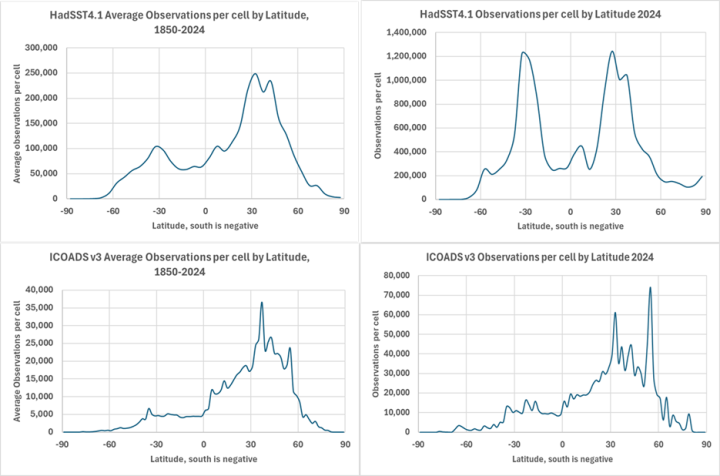 Figure 5 shows that HadSST reports a lot more observations per cell than ICOADS, even more than would be expected due to the larger HadSST cell size. Further, at latitude 30S, HadSST reports as many observations as at 30N for 2024, these observations are not seen in the ICOADS 2024 dataset. The ICOADS data is not interpolated or manipulated, thus the observations plotted in the lower half of figure 5 are real. HadSST does not interpolate, extrapolate, or infill cells to the extent that ERSST does, but they obviously do some. The methods used to interpolate, infill, and extrapolate values in HadSST are described in part in Rayner et al. (Rayner, et al., 2006). A lot of this is accomplished when combining the initial one-degree cells into the final five-degree cells.