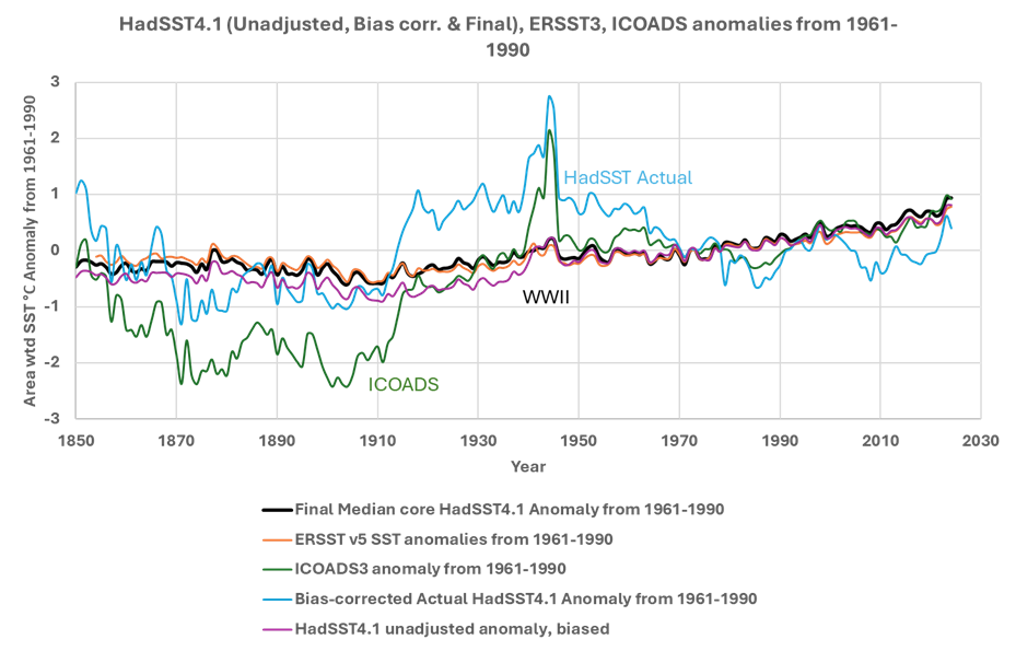 In figure 6 the ERSST, ICOADS and HadSST 4.1 actual temperatures are converted to anomalies by subtracting their respective 1961-1990 means from each grid cell value. This is different from the normal procedure of computing each anomaly by subtracting its individual reference mean from each value before processing and populating the grid. The normal procedure was used to build the plotted final median core HadSST 4.1 anomaly in figure 6. However, even though the other anomalies were computed differently, the ICOADS anomaly is a fairly close fit to the ERSST and final HadSST anomalies from the early 1990s to 2024.
