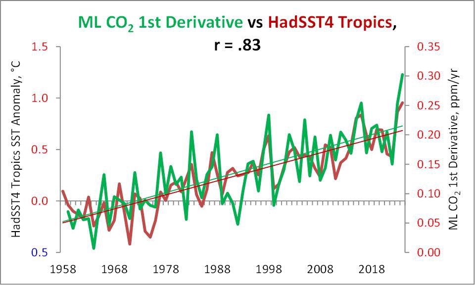 So for purposes of this analysis, let me take a value of ~ 10±4 ppmv for each 1°C warming of the top 100 meters of the ocean.