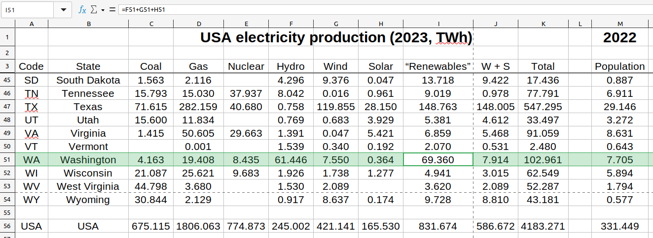 Note that I have selected the cell (I51) that shows a “Renewables” calculation for Washington state of :