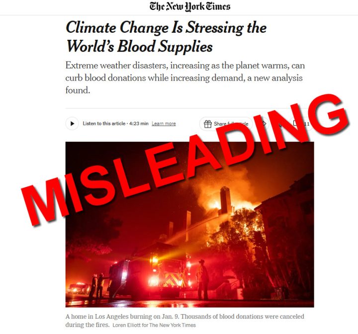 This article shows that the NYT continues to be wedded to promoting pseudoscientific climate alarmism. Rather than investigating the real causes complicating and limiting blood donation and delivery, ranging from donor apathy to poor planning, NYT chose to blame climate change: the convenient boogeyman for everything from crime, to immigration, to acne—now apparently, it’s coming for your blood. This NYT article is a perfect example of confirmation bias, cherry-picked anecdotes, and appeals to authority masquerading as science. This story lacks journalistic rigor. The story’s author uncritically parrots yet another flawed, agenda-driven study, without apparently investigating and confirming any of its assertions. Had she done even a modicum of research into the issue, and the writer were an honest broker, she would have been forced to conclude that because data shows that climate change isn’t causing more extreme weather, it can’t be creating new problems for the blood supply system.