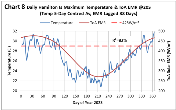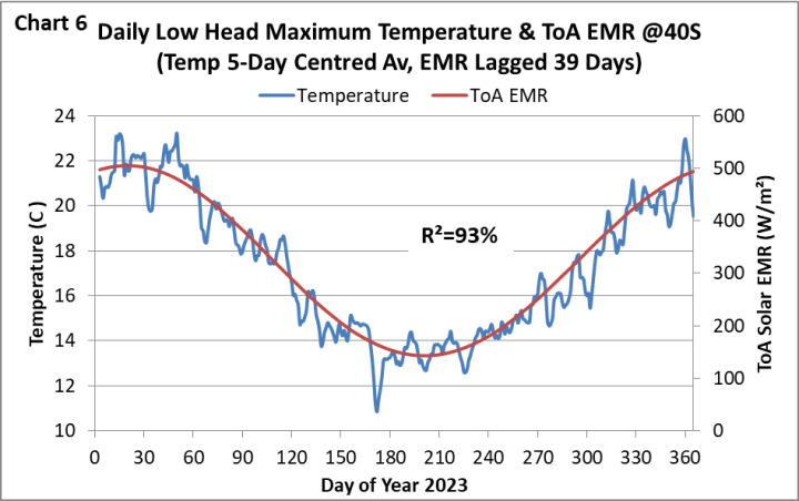 Looking at the thermal response to solar EMR at selected locations gives insight into zonal and seasonal response. The examples are taken from the BoM Climate Data as it provides easily accessible daily temperature readings for a large number of sites. The first example is a coastal location, Low Head, in northern Tasmania at 41S. Chart 6 is a plot of maximum daily temperature and ToA solar EMR at 40S for 2023.