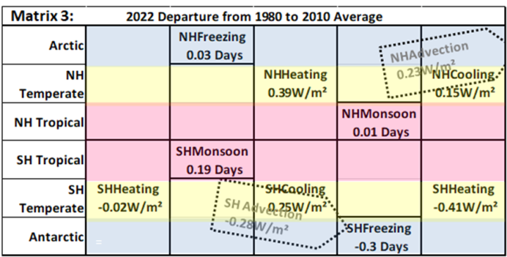 Looking back from 2025 to 1850, 2022 experienced the highest NH Heating season as shown in Matrix 3. The NH Cooling season was also up on average. By contrast, the SH Cooling was also up but the SH Heating season was down on the average.