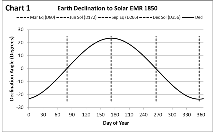 NASA JPL provides daily declination and distance data through the Horizons portal. Charts 1 and 2 show the values as determined for the two variables for every day of 1850. Chart 2 also includes the daily ToA EMR based on a solar constant of 1361W/m2.