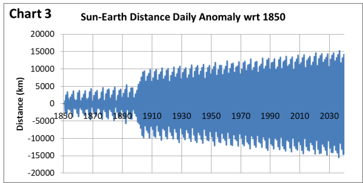 There has never been and never will be two days in Earth’s existence with identical Earth-Sun declination and distance. Charts 3 and 4 indicate how these variables have, and will, change from 1850 to 2040 as daily anomalies with respect to 1850. Each of the charts has 69,761 individual points so only the trends and significant variation are evident.