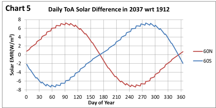 The significance of these changes in Earth’s geometric relationship to the Sun can be best appreciated by considering the spatial and temporal variation of solar EMR reaching Earth’s atmosphere for specified time and latitude. Chart 5 looks at the most significant difference for the 190 years examined here. It compares the difference in daily average intensity for both 60N and 60S through 2037 relative to 1912.