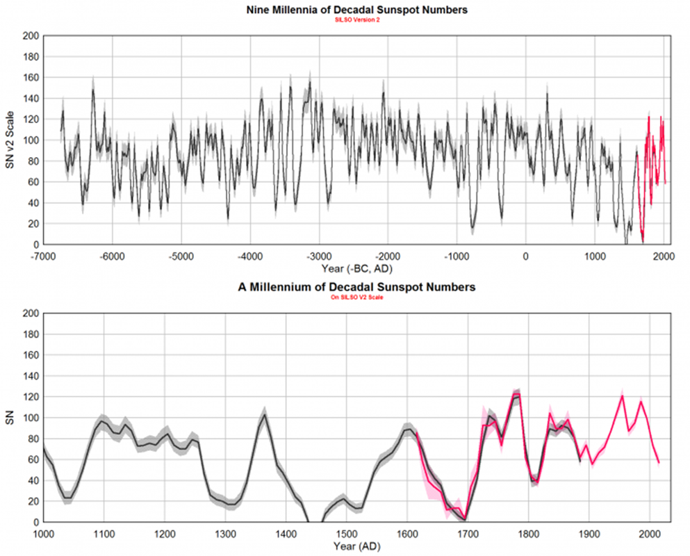 Usoskin etal (2016) in “Solar activity during the Holocene: the Hallstatt cycle and its consequence for grand minima and maxima” further defined those levels into 30-year averages of 20 SN and 55 SN (v1 SN), respectively for grand minima and maxima.
