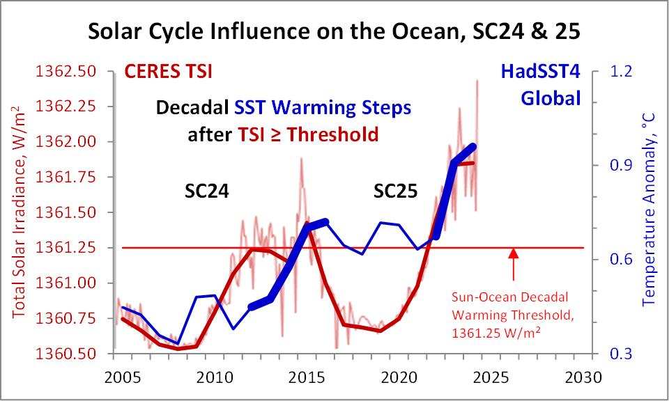Solar activity usually imparts enough additional absorbed solar radiation (via albedo help) that leads to decadal ocean warming. The ocean responds within a year of a solar cycle increase over 95SN.