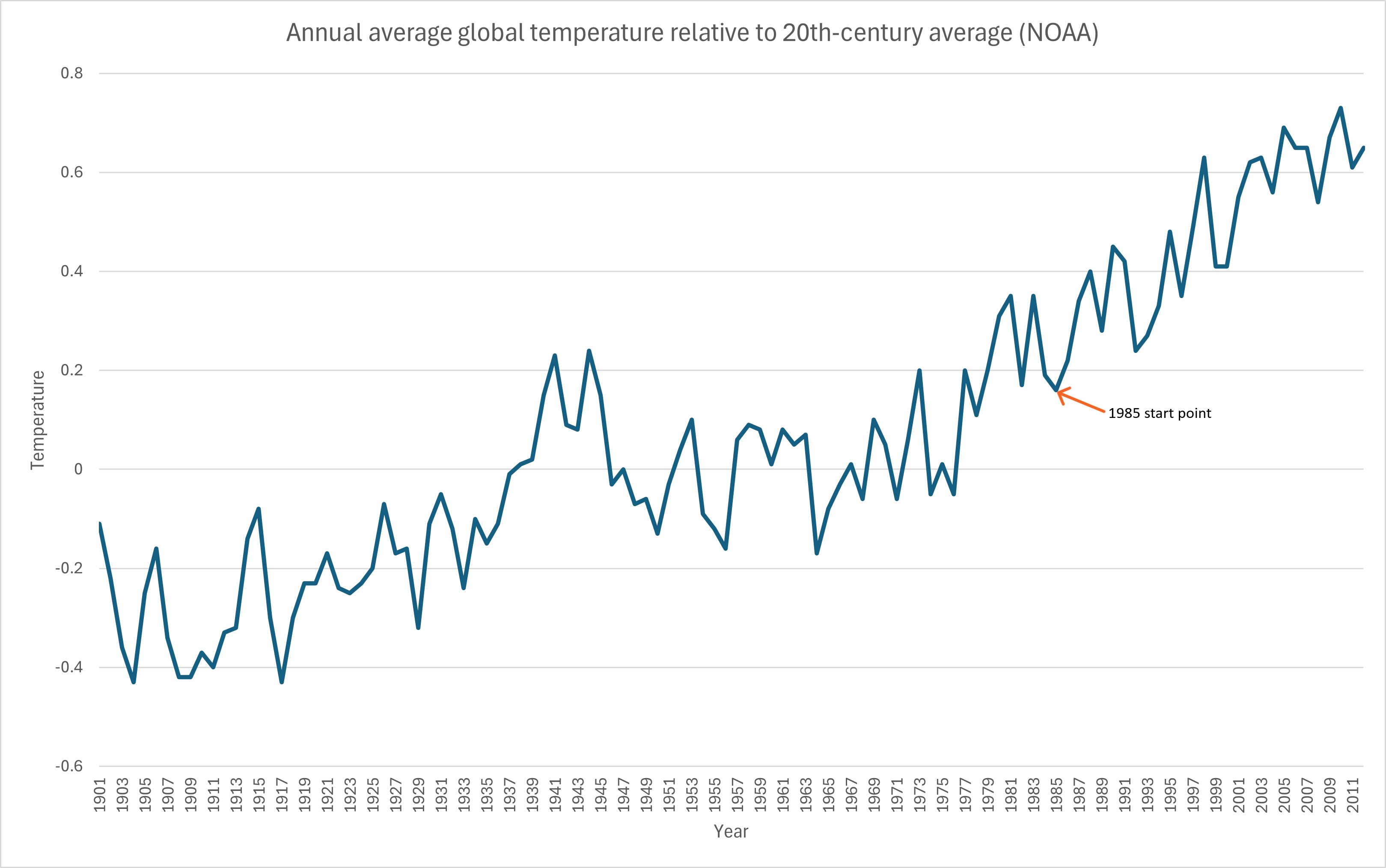 What about his odds statement? Well, not all strings of words are meaningful, and his is not. Before we proceed, let’s ground ourselves with this graph of global temperatures from 1901-2012.