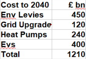 Then we come to heat pumps. By 2040, everybody with a gas boiler will need to replace with a heat pump. I believe about 20 million homes have gas boilers. Including extra insulation, hot water tanks and radiators, we are probably looking at £15,000 a go, compared to £3000 for a boiler. That’s a total cost of £240 billion.