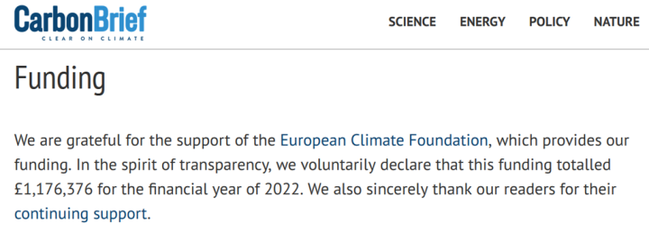 We must always bear in mind that Carbon Brief receives more than a million pounds in funding a year from the notorious ECF, the organisation set up to channel billions from far-left US foundations to European bodies like Carbon Brief in order to spread climate misinformation.