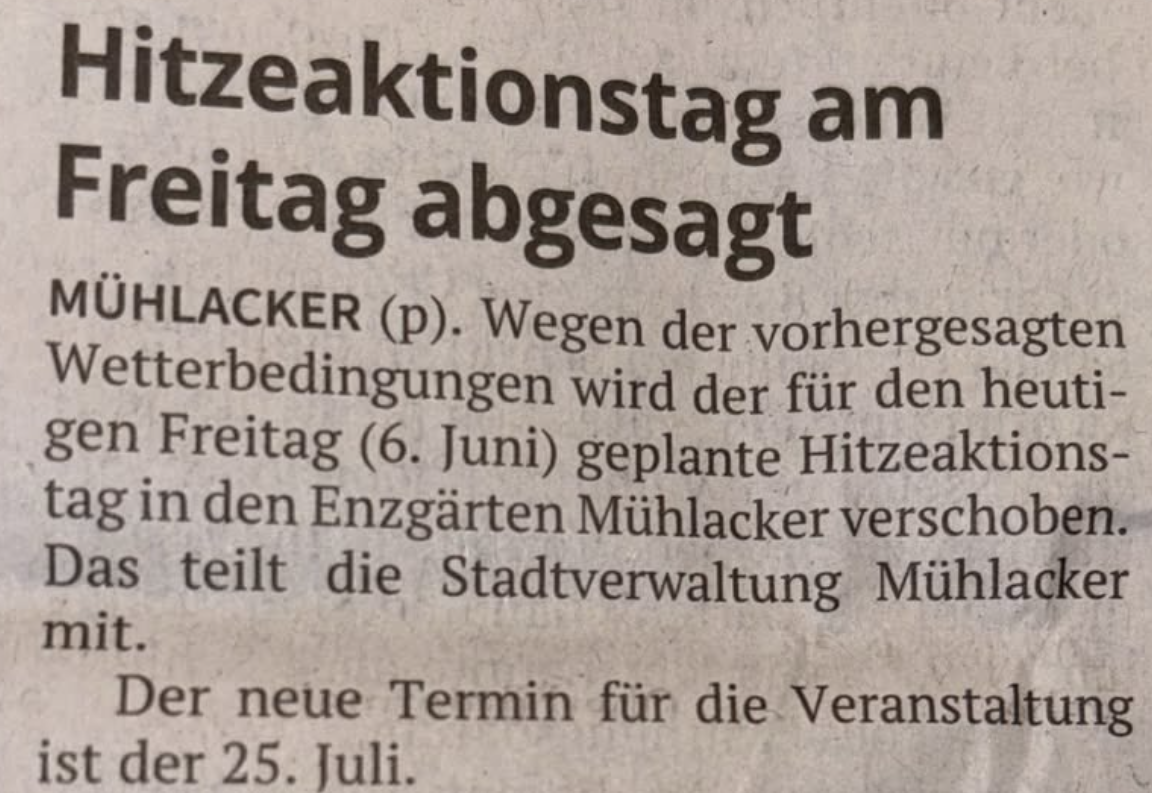 The heat action day has been postponed to Friday, July 25, 2025. The weather yesterday, June 6, in Muehlacker was indeed rainy and cool, with highs not even reaching 20°C – obviously too harsh for the organizers!