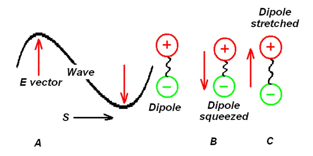As the EM wave (A) passes by, what our atom sees is first a downward electric field vector that squeezes the two masses together (B), then a passing upward electric field vector that stretches them apart (C), and so on. The passage of the EM wave is setting the dipole into vibration, which also means putting energy into it.