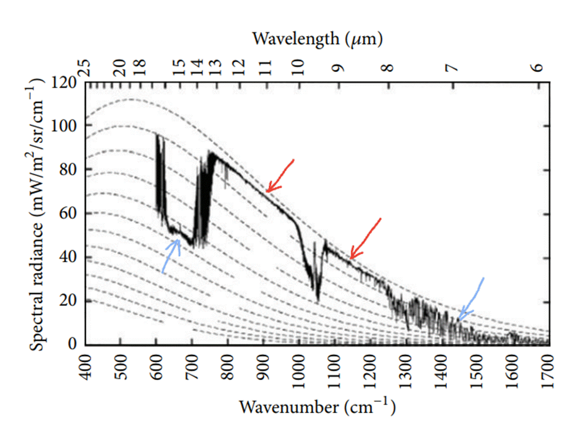 For example, Figure 6 shows a spectrographic measurement of Earth’s surface measured from a satellite. In the broad section from wavenumbers 800 to 1200 cm-1 demarcated by red arrows, apart from a dip in the spectrum near 1050 cm-1, the curve looks almost like a blackbody spectrum from a source at 290K – the Earth’s surface, in other words. This is a clear window in the atmosphere where the spectrometer sees the surface unimpeded. Meanwhile the blue arrows denote sections of the spectrum where CO2 and H2O block direct view of the surface and the spectral brightness comes from the last few km of CO2-rich atmosphere near the tropopause (220K) or top of water vapor-rich atmosphere near 2 km above the surface.