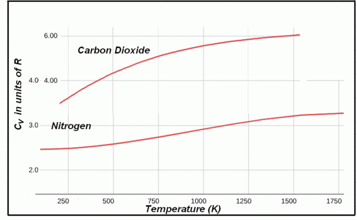 Figure 4 shows the heat capacity at constant volume for nitrogen and carbon dioxide between 200K and 1800K. From 200K to around 400K or so, the curve for nitrogen is very flat and equal to 5/2 R, where R is the gas constant. By kinetic theory of gasses this suggests at typical Earth atmosphere temperatures 200-300K, a nitrogen atmosphere has five degrees of freedom – three translations in x, y , and z, plus two rotations are all fully participating in energy storage, and the average energy per nitrogen molecule is 5kT, where k is Boltzmann’s constant. At 300K this is 2×10-20 J or about 0.13 eV per atom. Vibrational states for nitrogen are not involved until much higher temperatures.