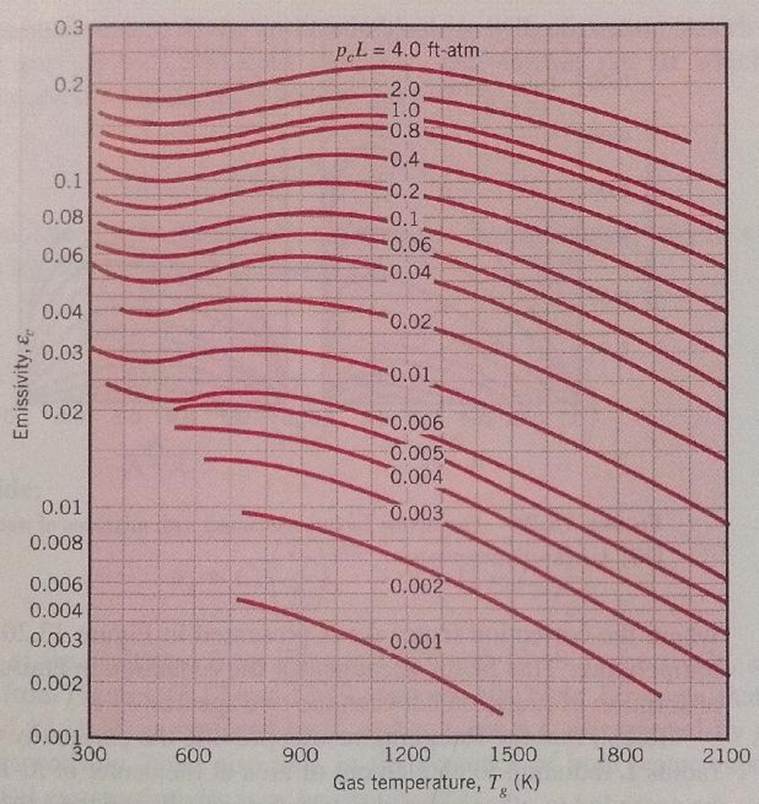 Figure 5. The effective emissivity of CO2 mixed with non-participating gasses depends on pressure, temperature, and path length. From Incropera and Dewitt, Fundamentals of heat and Mass Transfer.