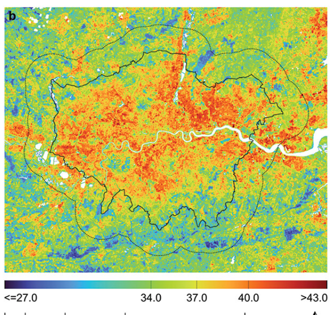 Figure 1b, Mean land surface temperature (LST, °C) for Greater London (2013-2023). Ref: https://www.tandfonline.com/doi/full/10.1080/23748834.2025.2489854