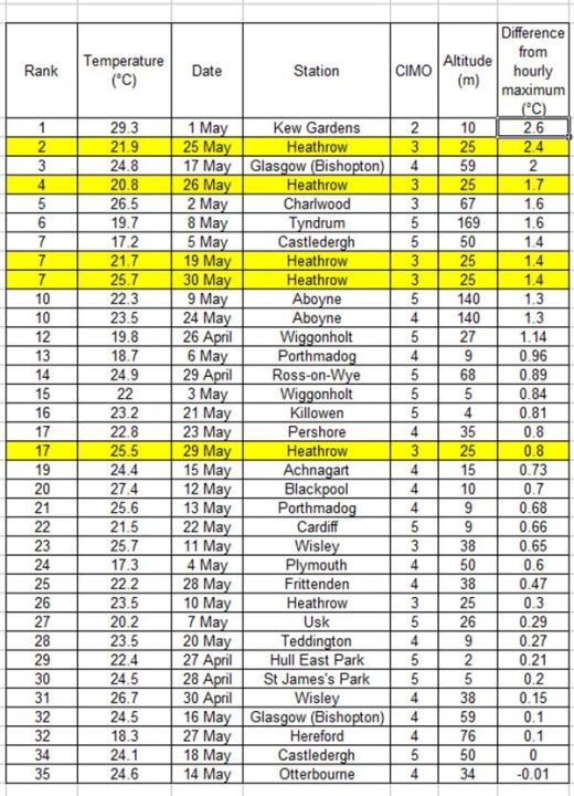 Temperature recordings can move around from minute to minute; change, if it occurs, is generally around 0.1°C to 0.3°C. These changes do not affect old-style mercury thermometers but are picked up by the super-sensitive electronic devices used by the Met Office since the 1990s. It is for this reason that the World Meteorological Organisation (WMO) recommends averaging readings over five minutes to standardise data and remove short-term ‘noise’. For some inexplicable reason, despite playing a significant role in WMO deliberations, the UK Met Office does not appear to want to follow this sensible scientific advice. At Kew on May 1st the hourly recordings showed a typical convex curve of temperature movement during the afternoon recording seven readings from noon to 6pm of 26.88°C, 26.93°C, 26.7°C, 28.54°C, 28.41°C, 26.09°C and 25.15°C. The 29.3°C record came out of the blue as did an earlier spike to 28°C at 1.28pm.