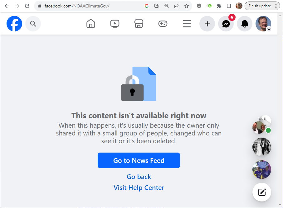 To that end, my access to https://www.facebook.com/NOAAClimateGov/ has been blocked since late 2021, and the comments which I had posted there before I was blocked have apparently been deleted. Here’s what I see when I visit that page: