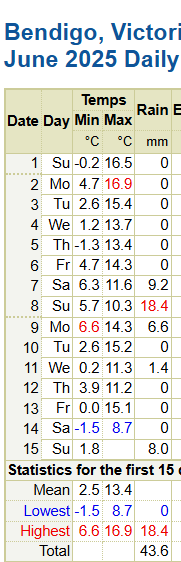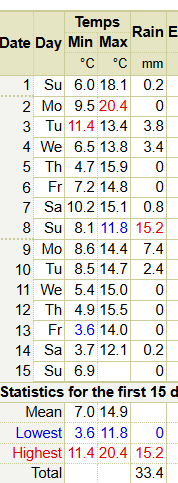 Here is the month so far in Bendigo, which normally ranges from 3.6°C to 13.4°C. This year, the average max is indeed 13.4°C, but the min is 8.7°C! There was one cold day with max 4.7°C below normal.